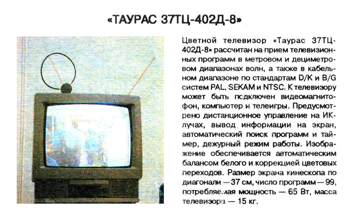 Цветной телевизионный приёмник "Таурас 37ТЦ-402Д-8" подготовил к выпуску с начала 1994 года Шауляйский телевизионный завод.