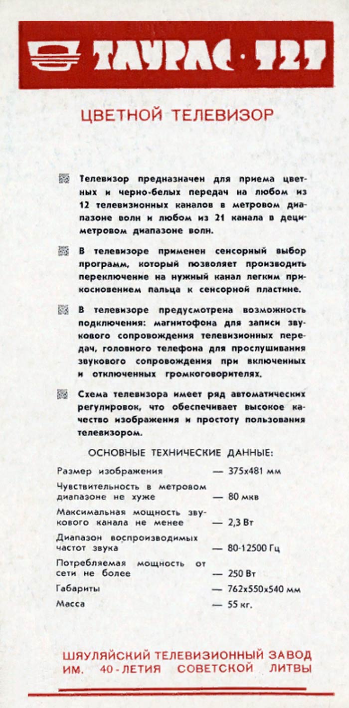 Цветной телевизионный приёмник "Tauras-727" ("Таурас-727") выпускался с 1981 года Шауляйским телевизионным заводом. Информация ниже.