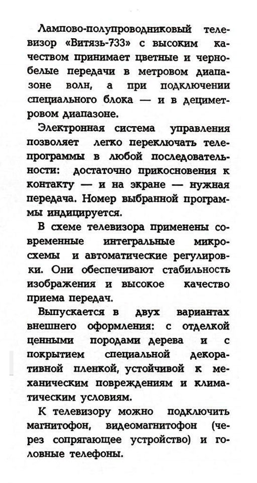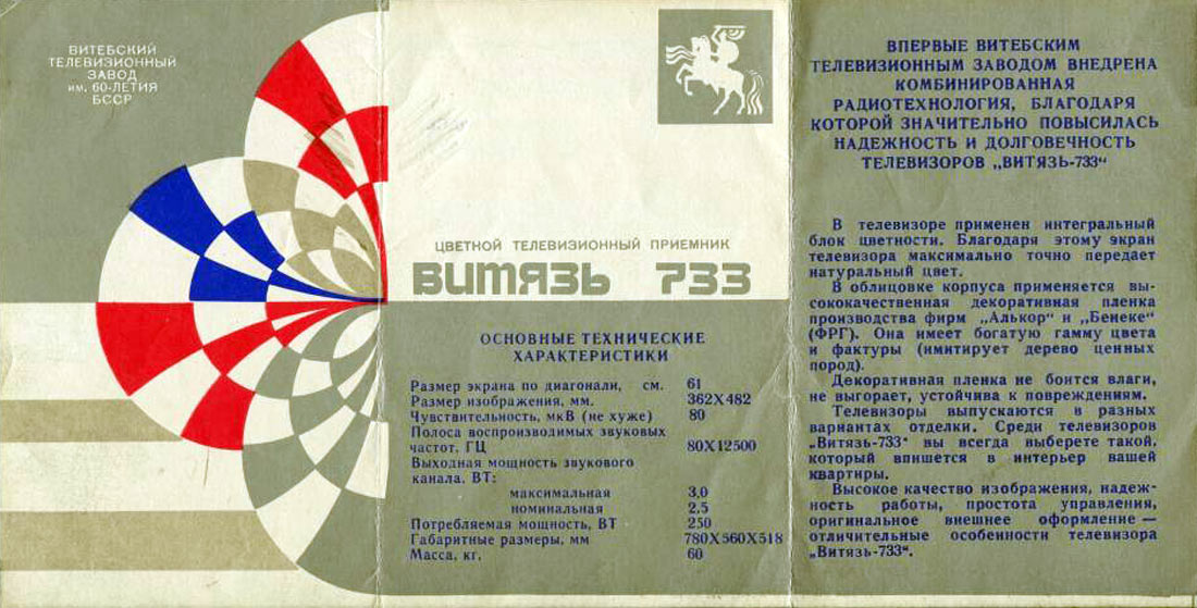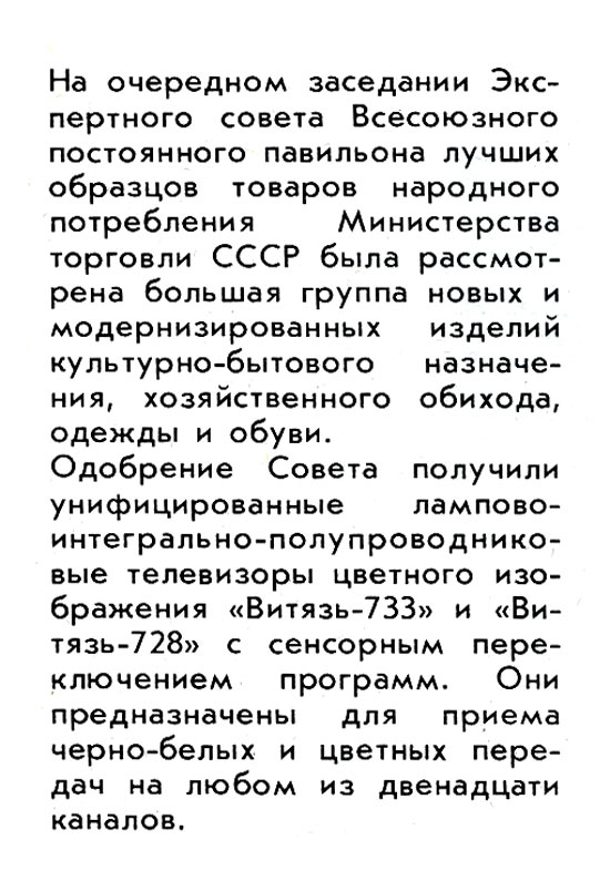 Цветные телевизоры "Витязь-728" и "Витязь-733" с 1979 и 1981 года выпускал "Витебский телевизионный завод". Описание моделей в рекламе.