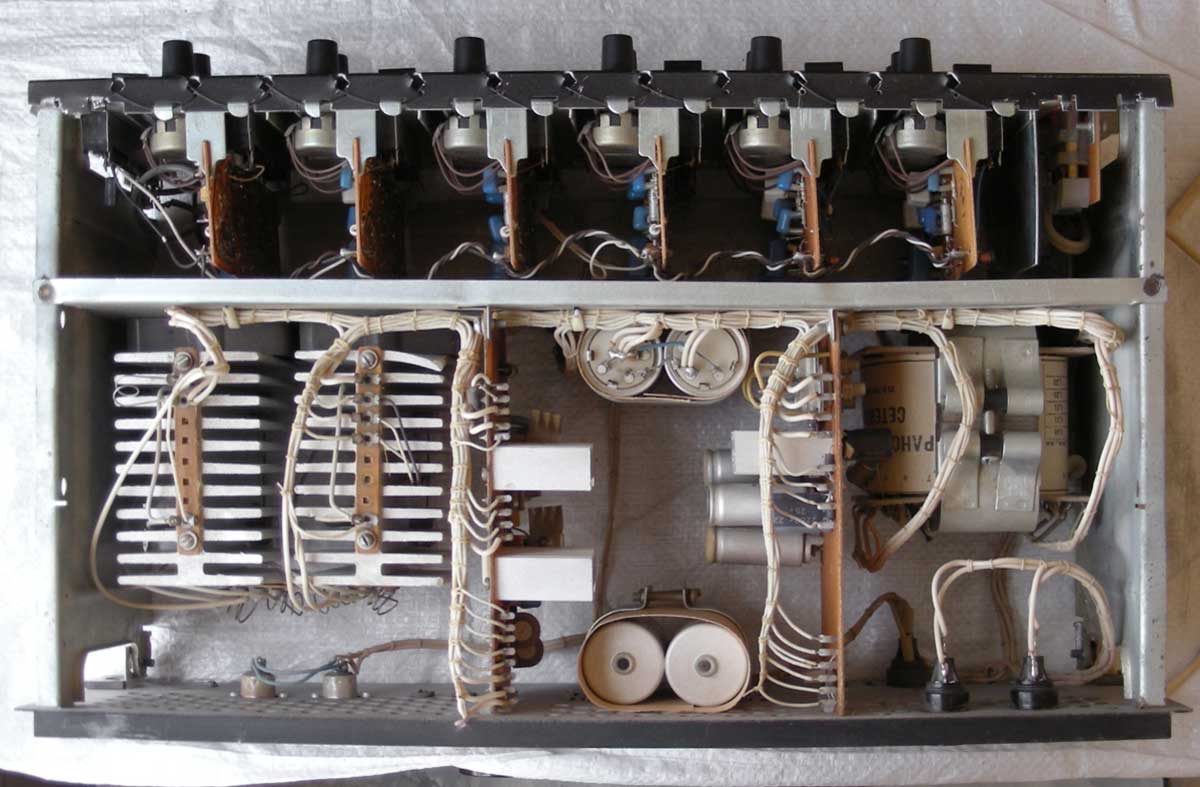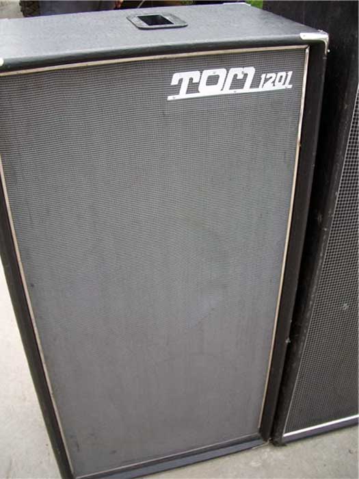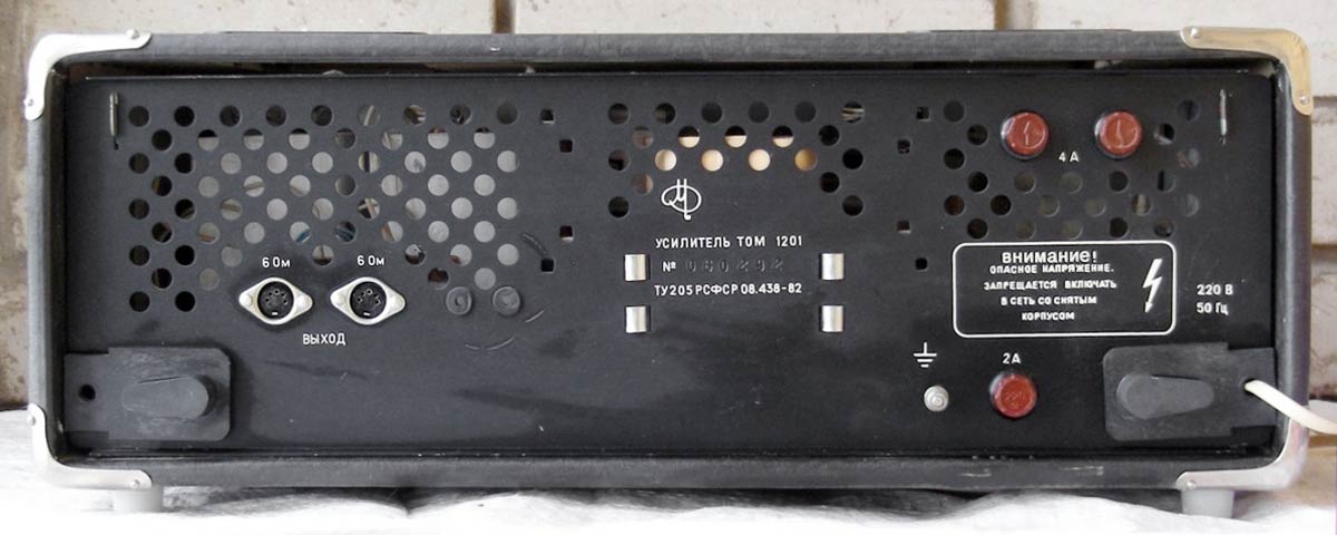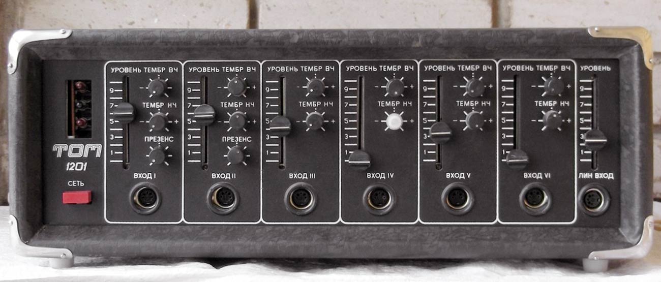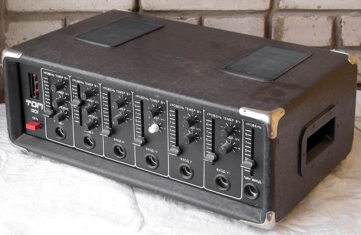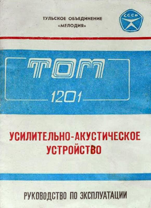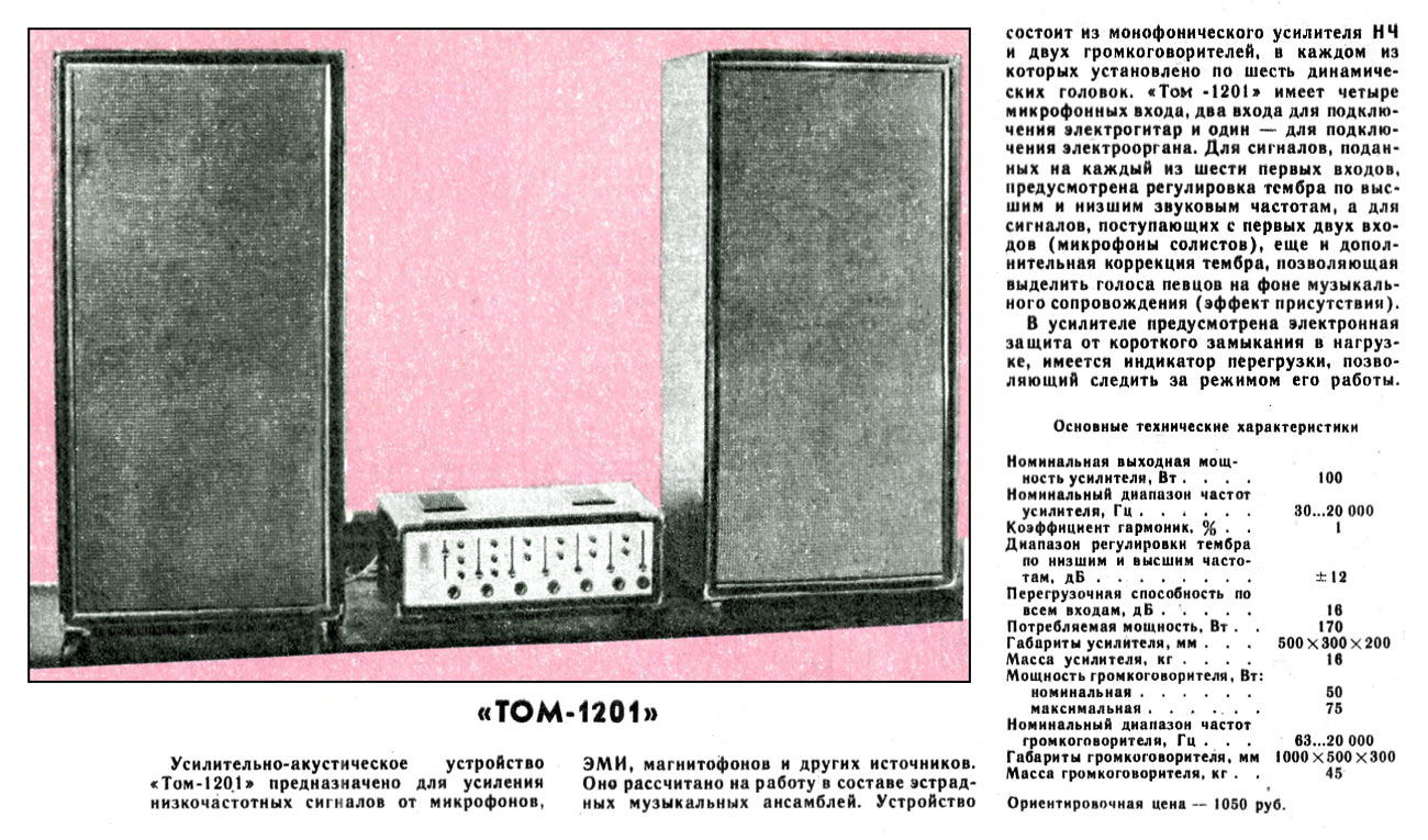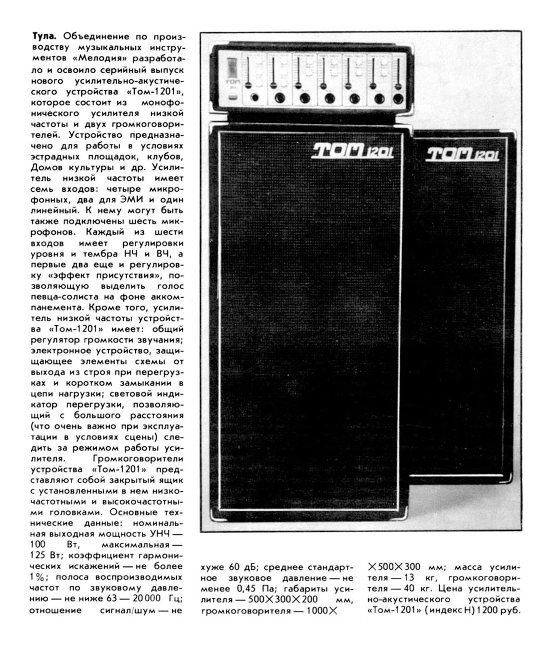 Усилительно-акустическое устройство "Том-1201" с I-кв 1981 года выпускало Тульское объединение музыкальных инструментов "Мелодия". УАУ предназначено для усиления сигналов от микрофонов, ЭМИ, магнитофонов и других источников. Оно рассчитано на работу в составе эстрадных музыкальных ансамблей и состоит из монофонического усилителя НЧ и двух АС, в каждой из которых установлено по 6 головок. УАУ имеет 4 микрофонных входа, 2 входа для подключения электрогитар и один для электрооргана. Для сигналов поданных на каждый из 6 первых входов, предусмотрена регулировка тембра по ВЧ и НЧ, а для сигналов поступающих с первых 2-х входов (микрофоны солистов) есть ещё и коррекция тембра, позволяющая выделить голоса певцов на фоне музыкального сопровождения. В УАУ есть электронная защита от КЗ нагрузки, имеется индикатор перегрузки, позволяющий следить за режимом его работы. Номинальная выходная мощность УАУ - 100 Вт. Номинальный диапазон частот 30...20000 Гц. КНИ 1%. Диапазон регулировки тембра ±12 дБ. Потребляемая мощность 170 Вт. Габариты УАУ 500x300x200 мм. Масса 16 кг. Номинальная подводимая мощность к одной АС 50, максимальная 75 Вт. Диапазон частот 63...20000 Гц. Габариты 1-й АС 1000 х 500 х 300 мм. Масса 45 кг. Цена УАУ с двумя АС - 1050 рублей.      Информация из журнала Радио № 9 за 1982 год.    Фото Василия Васильевича Мосолова, Обнинск.