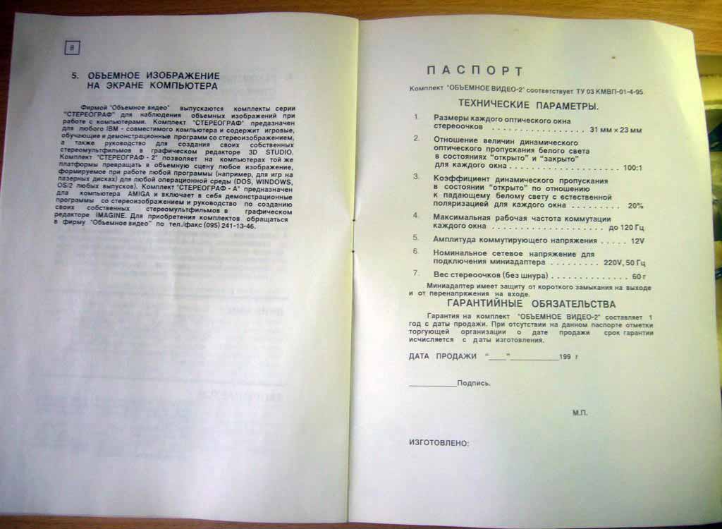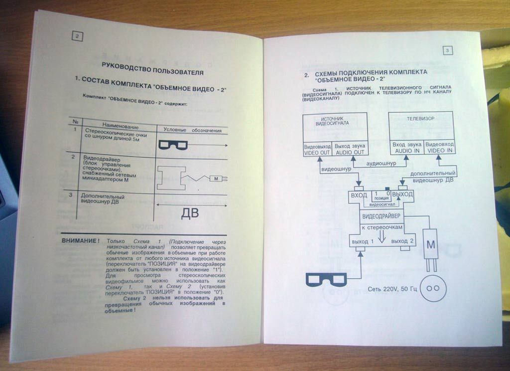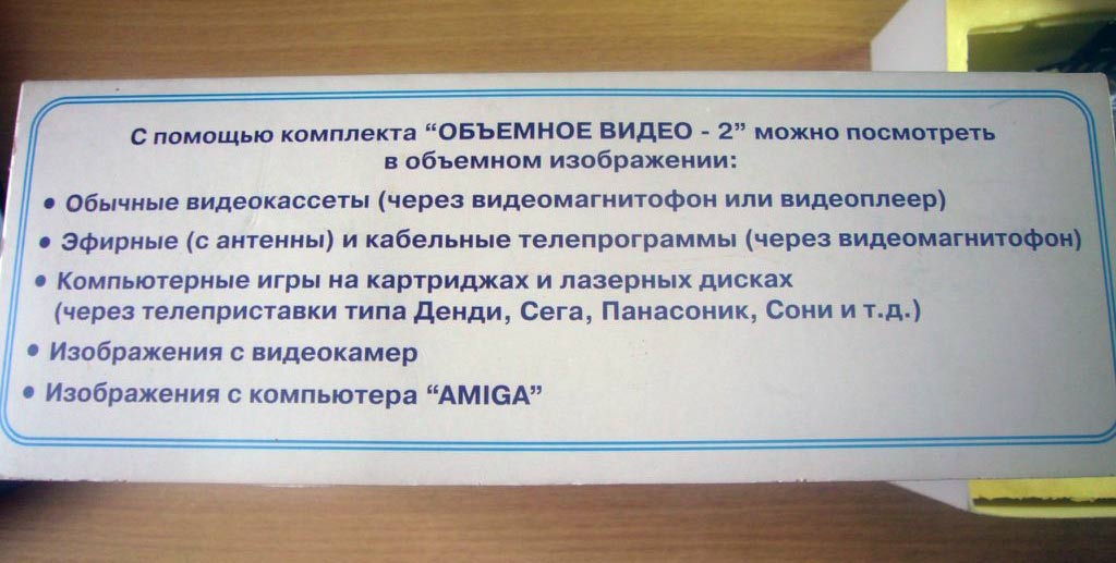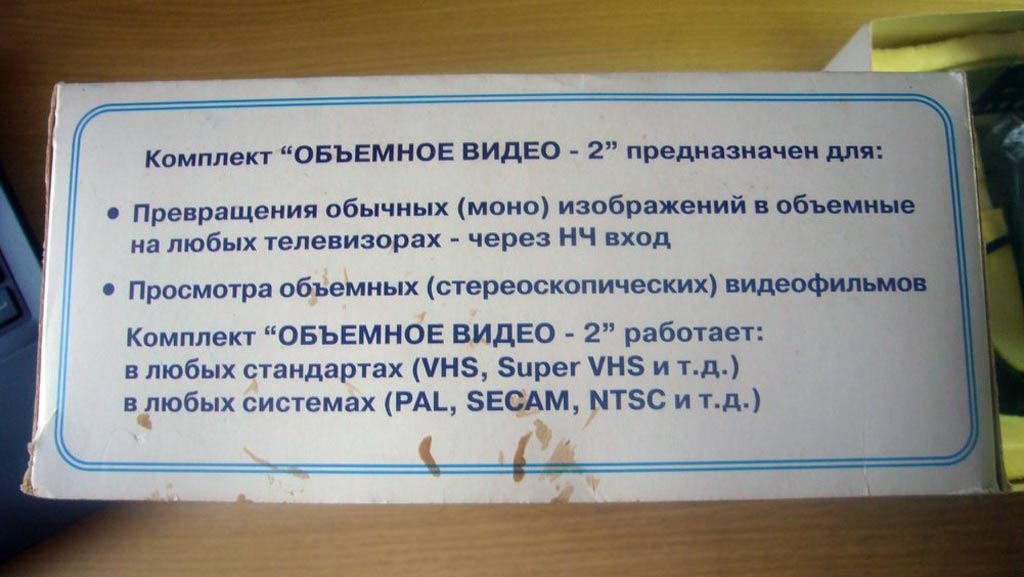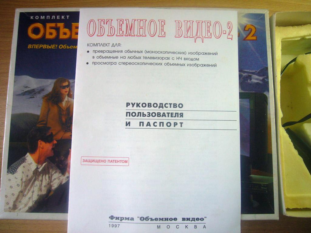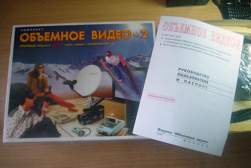Комплект "Объёмное видео-2" выпускался с 1997 года Московской фирмой "Объёмное видео". Комплект служит для преобразования обычных моноскопических изображений в стереоскопические и их просмотра.