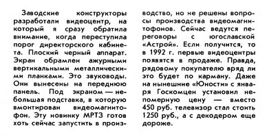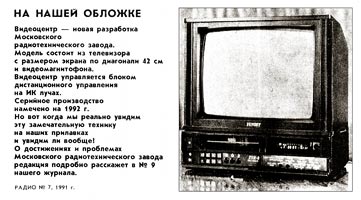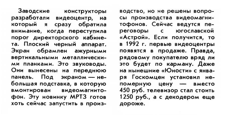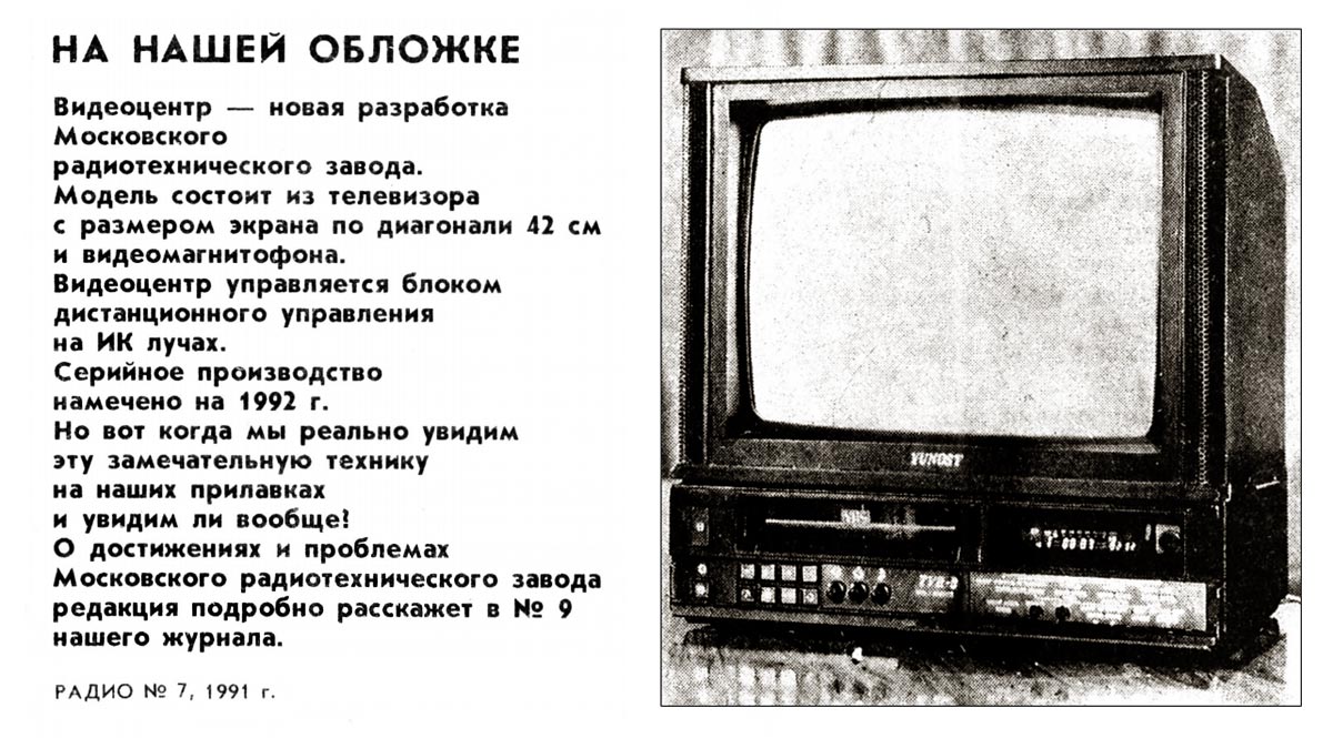 Цветной телевизор с видеомагнитофоном (видеодвойка) "Юность" подготовлен к выпуску с 1992 года Московским радиотехническим заводом (МРТЗ).
