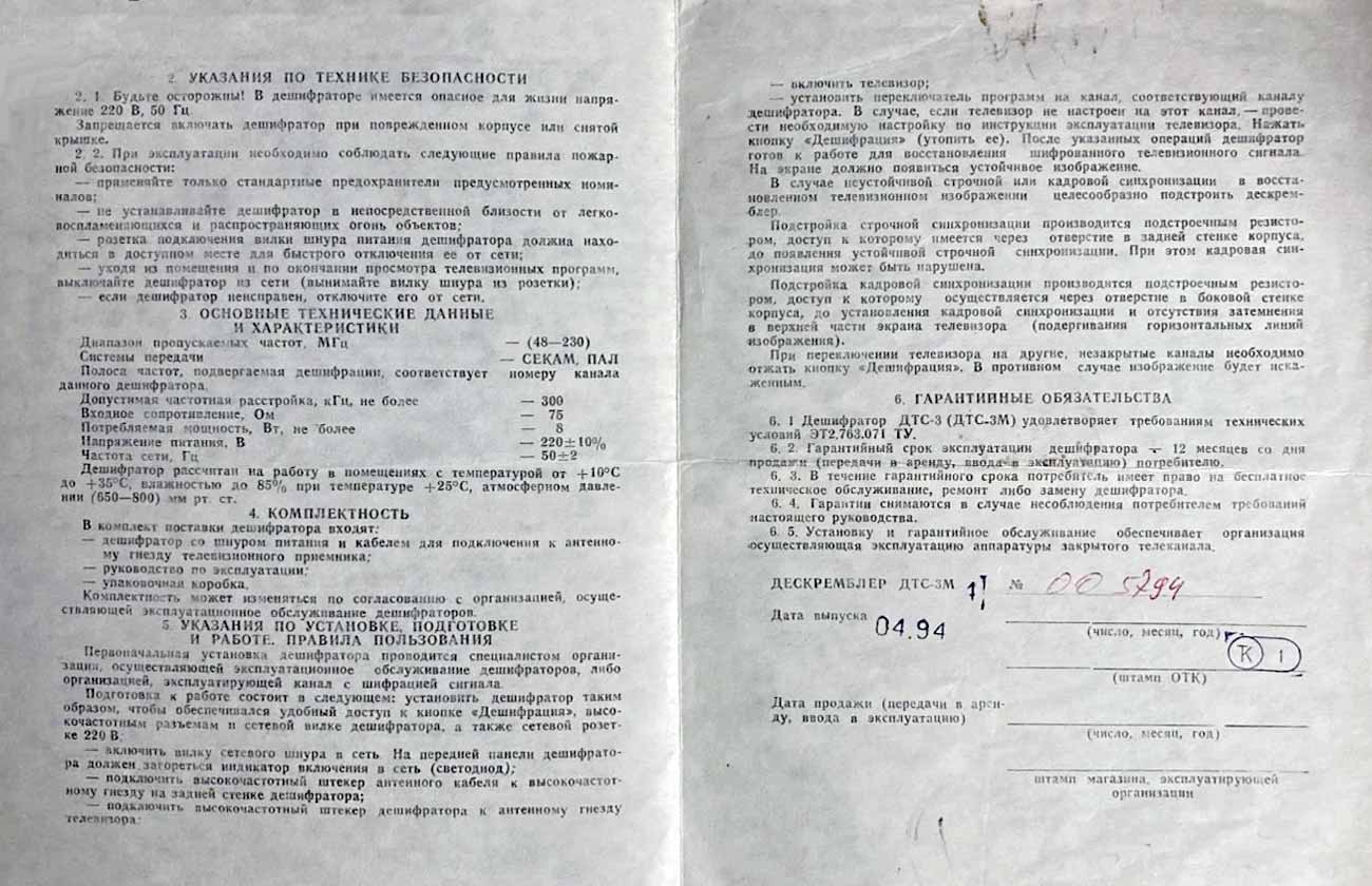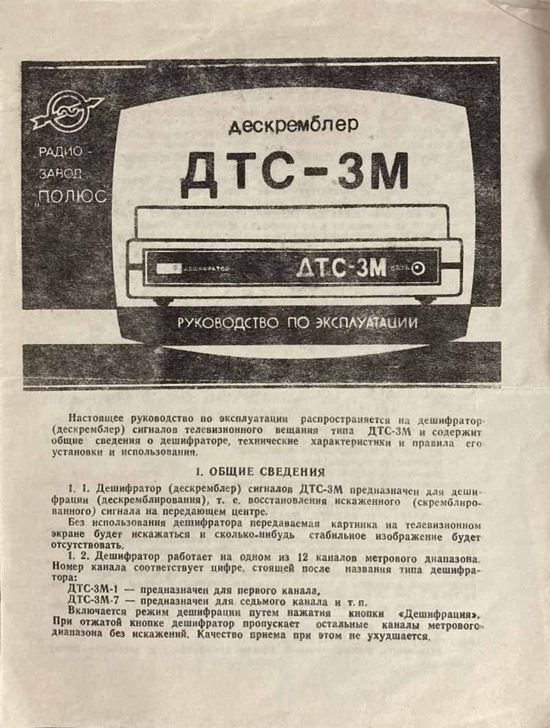 Десклембер (дешифратор) "ДТС-3" выпускался с 1990 года Воронежским радиозаводом "Полюс". Он же "ДТС-3М", "ДТС-3М-1", "ДТС-3М-7" и т.д. Служит для дешифрации телевизионного сигнала.