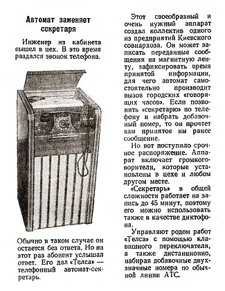 Телефонный автомат-секретарь "Телса" разработан в 1960 году Киевским совнархозом. Он работает как автоответчик, логический информатор и диктофон.
